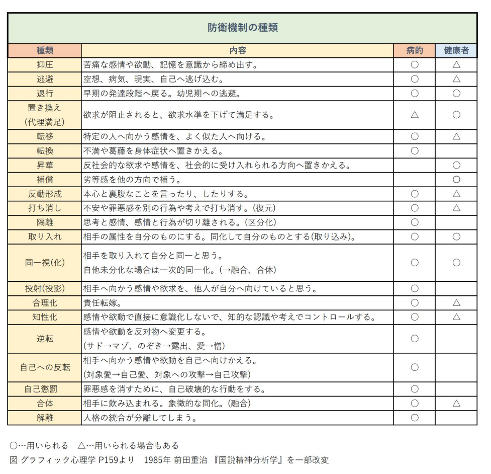 無料記事, 非会員向け 心理的防衛機制 病的、または健康者に起きる心理現象 ※○印に一部間違いがあり修正済みです 心理的な防衛機制には色々なものがあります。 今回は一覧の図を皆さんが見られるように致しますので、自己分析の参考になさってください。 動画の中でも話しておりますが、一見して理解しても誤解してしまう可能性がありますのでご注意ください。 ※画像clickで画像のみ表示 2023-09-28 0